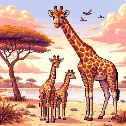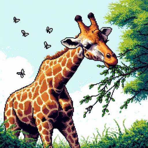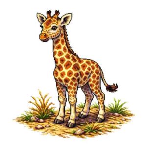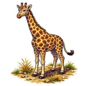とても長い首と足をもち高い木の葉を食べる草食動物。おだやかだが蹴りは強力で外敵を遠ざける力がある。